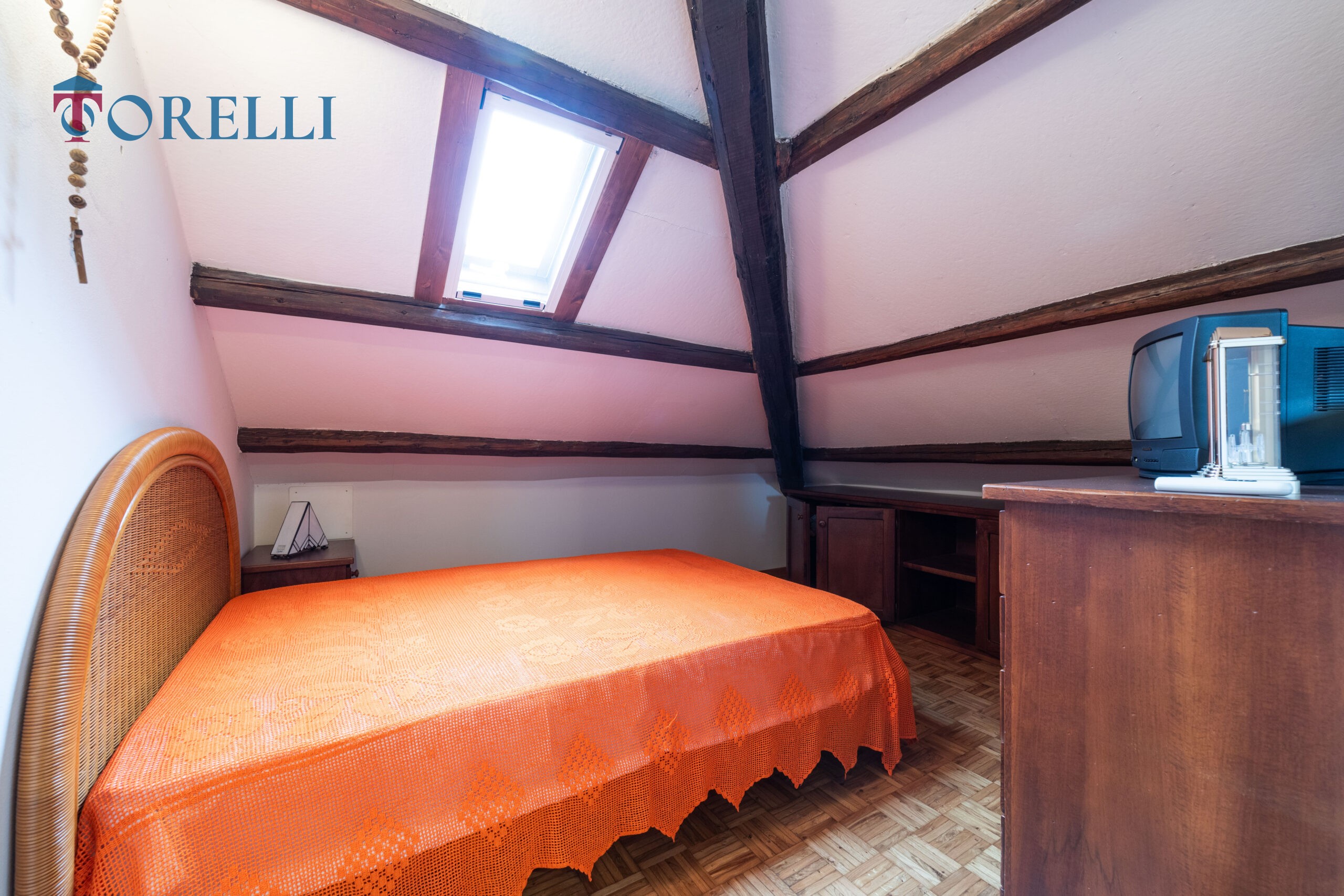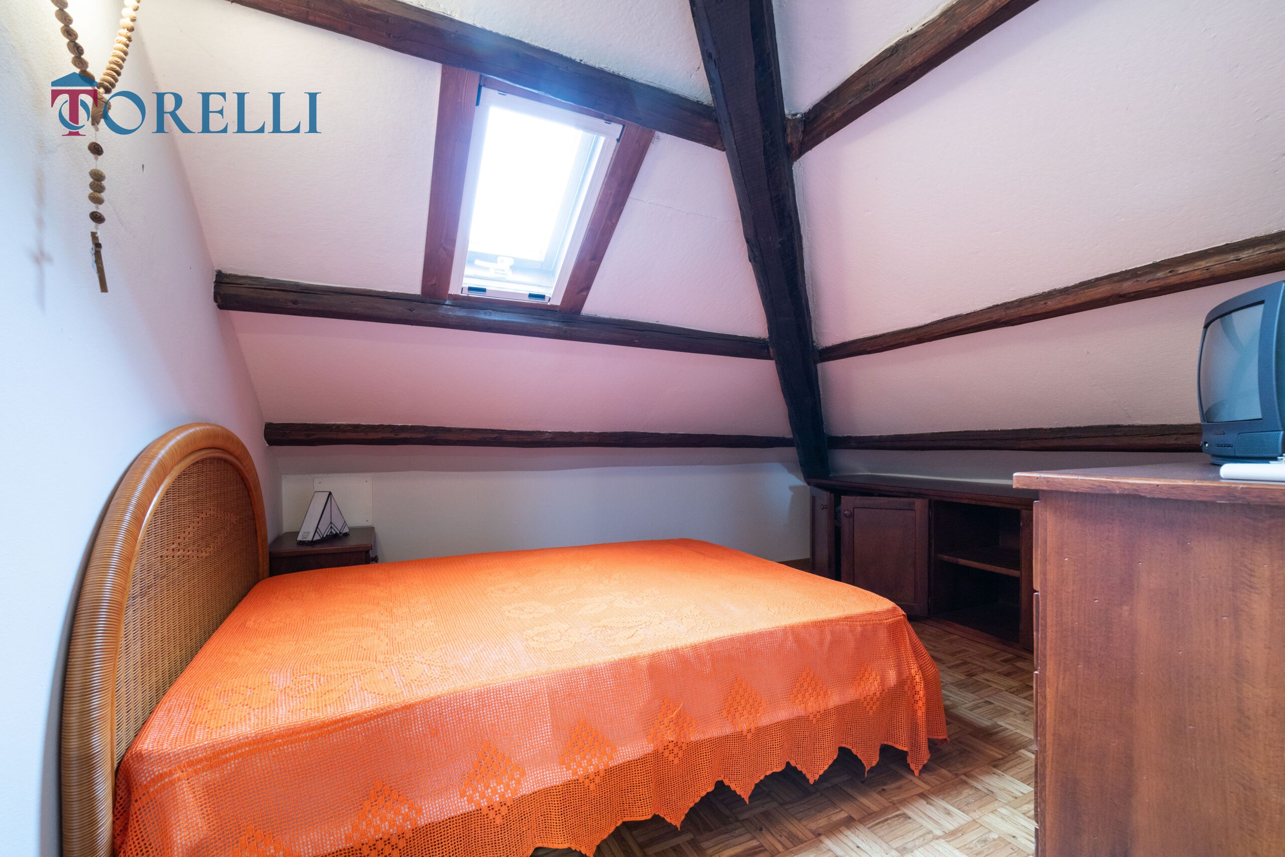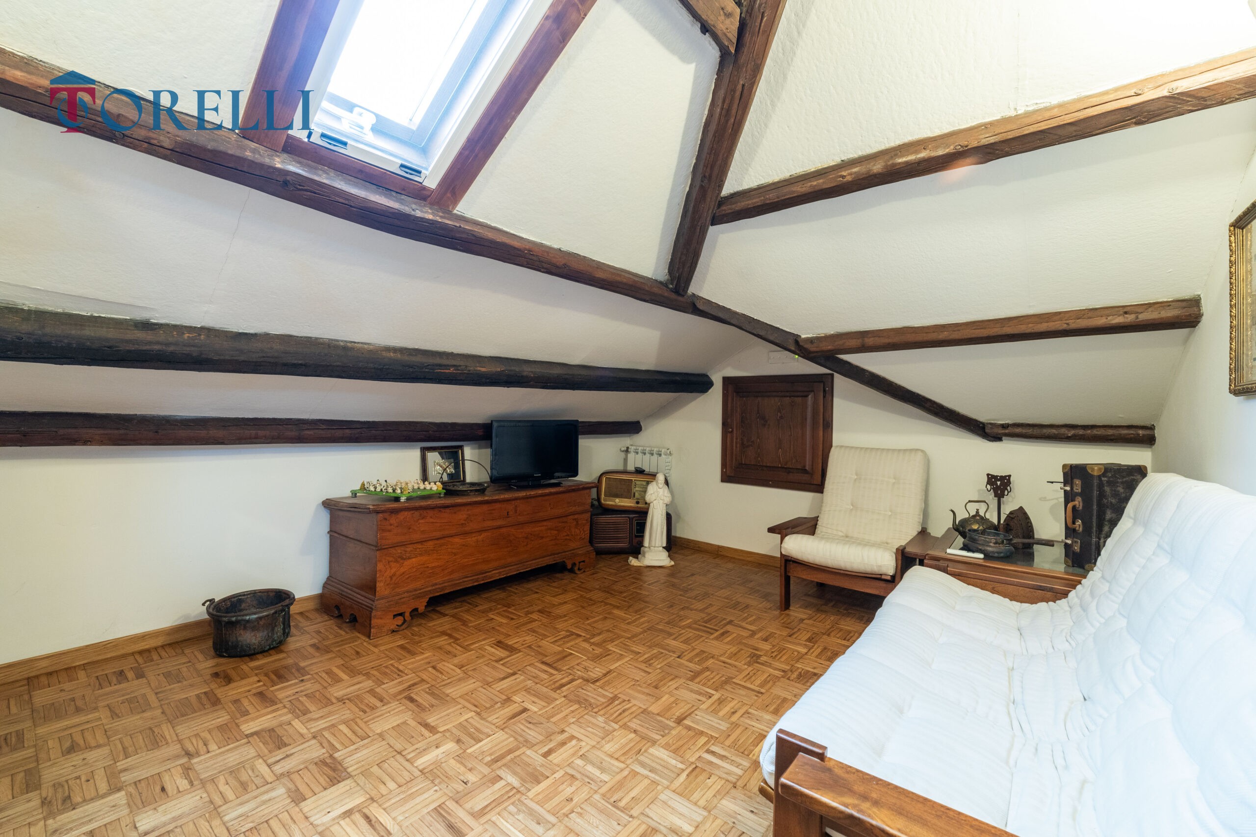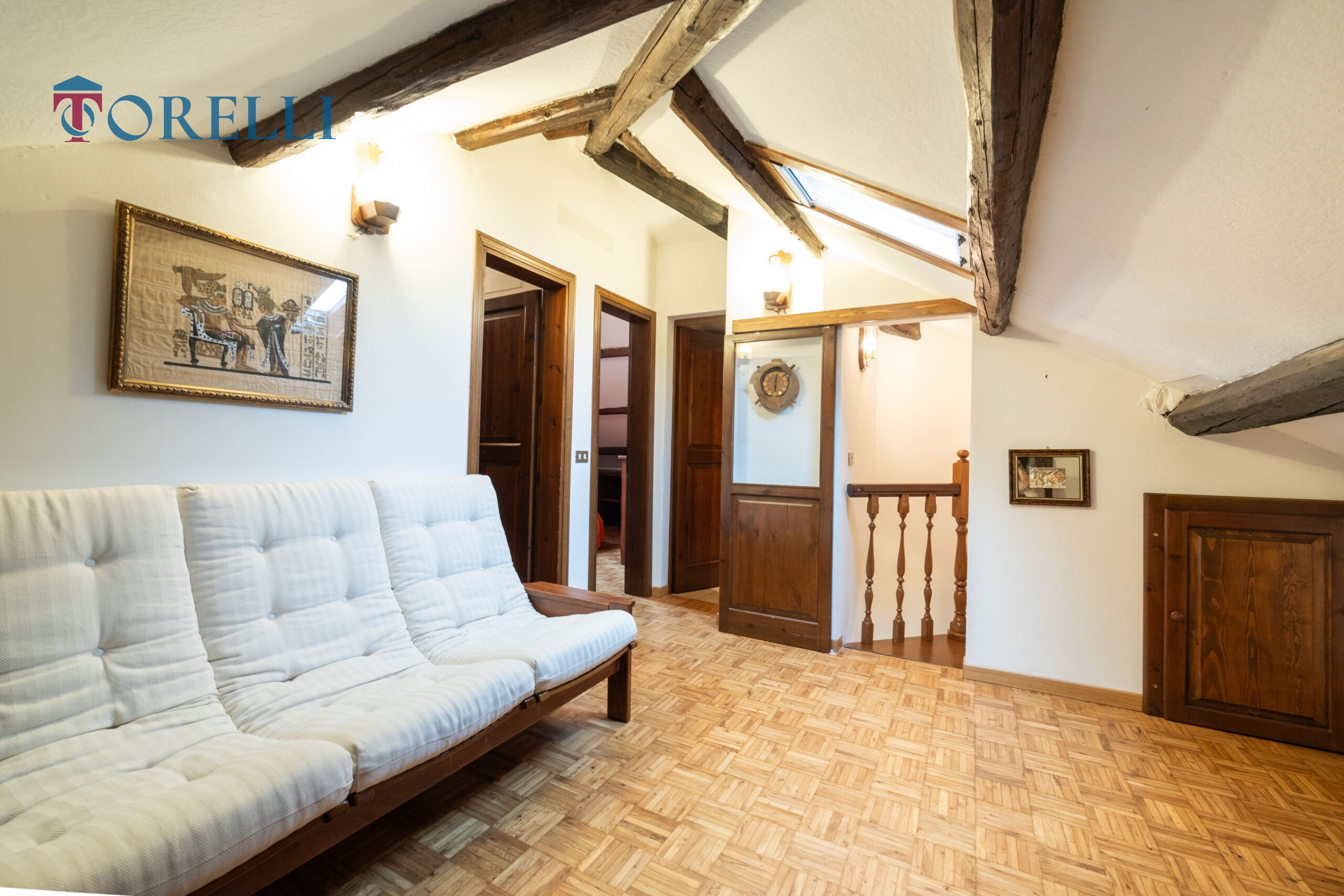 Una scala in legno conduce al piano superiore, caratterizzato da suggestive travi in legno a vista, dove si sviluppa un ambiente versatile composto da ampio guardaroba, ulteriori spazi multifunzionali, ideali come area relax, zona giochi per i bambini o spazio hobby e un secondo bagno.