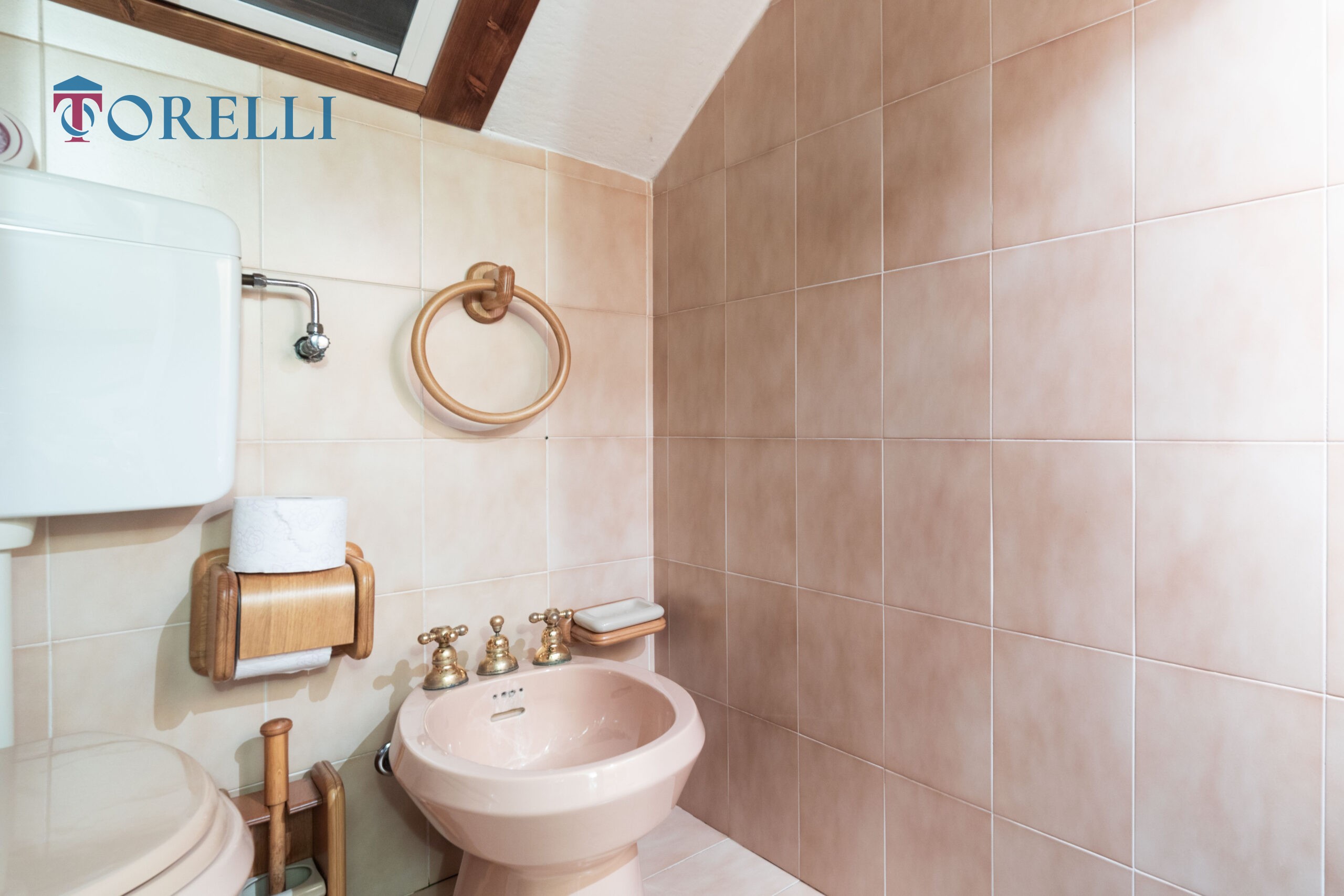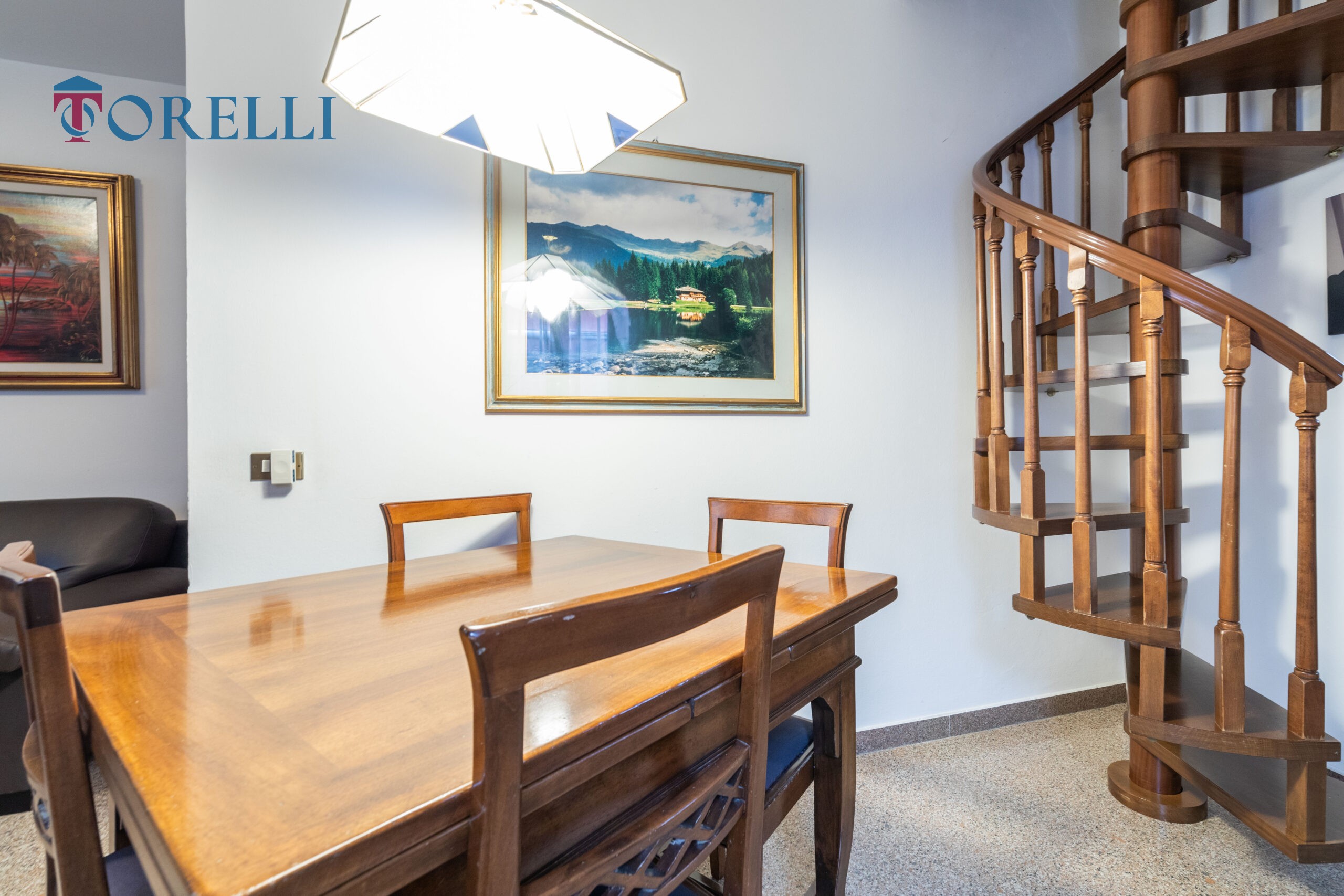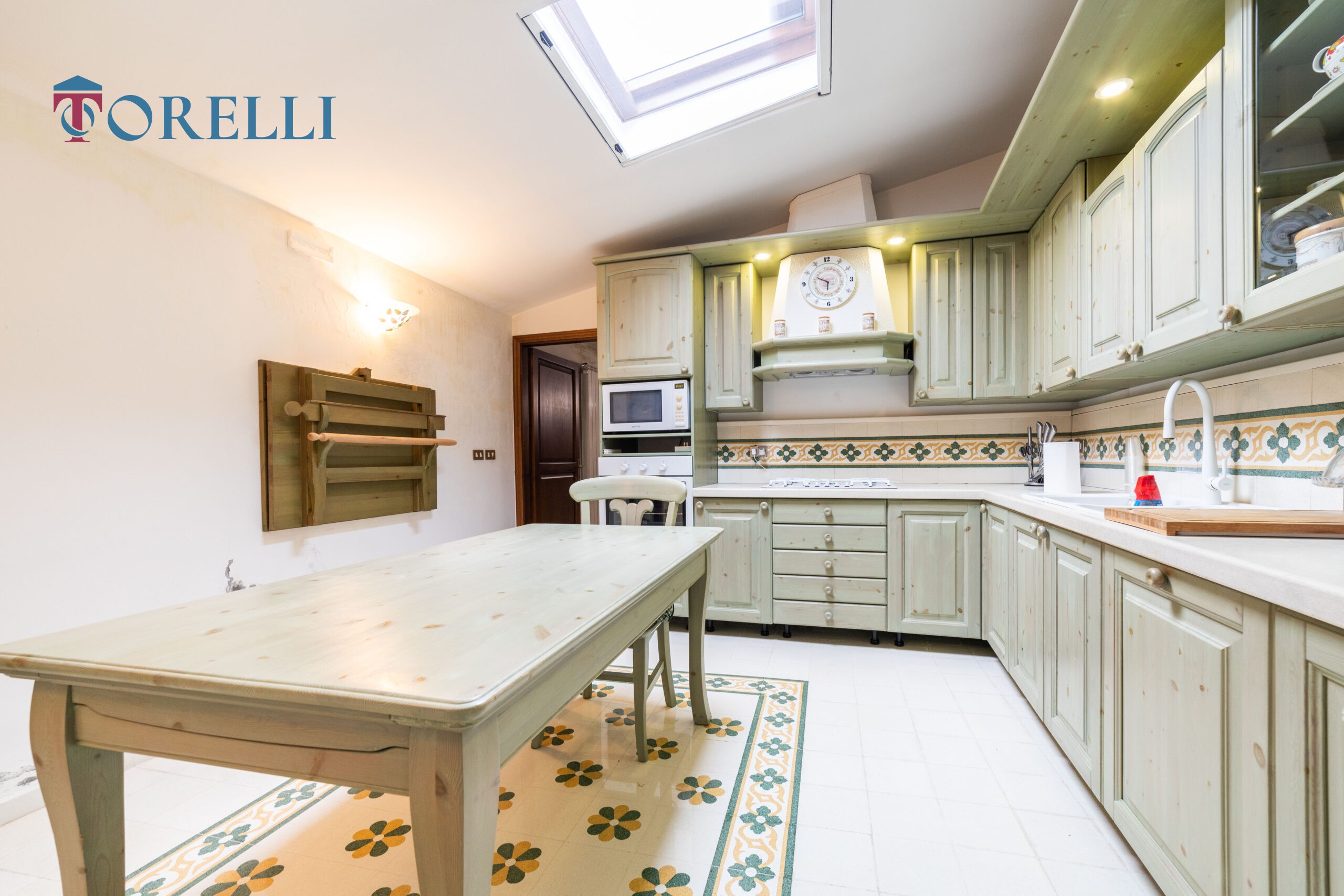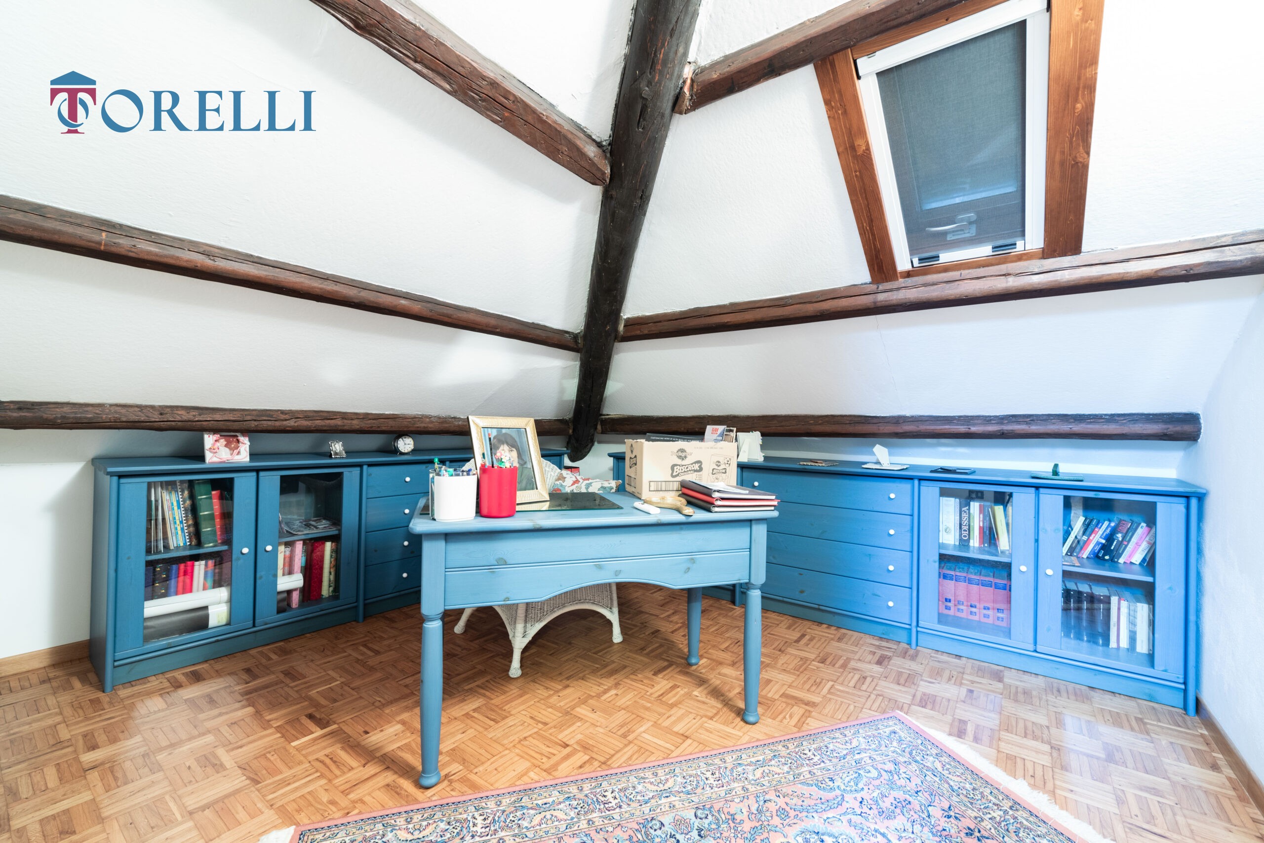 Una scala in legno conduce al piano superiore, caratterizzato da suggestive travi in legno a vista, dove si sviluppa un ambiente versatile composto da ampio guardaroba, ulteriori spazi multifunzionali, ideali come area relax, zona giochi per i bambini o spazio hobby e un secondo bagno.